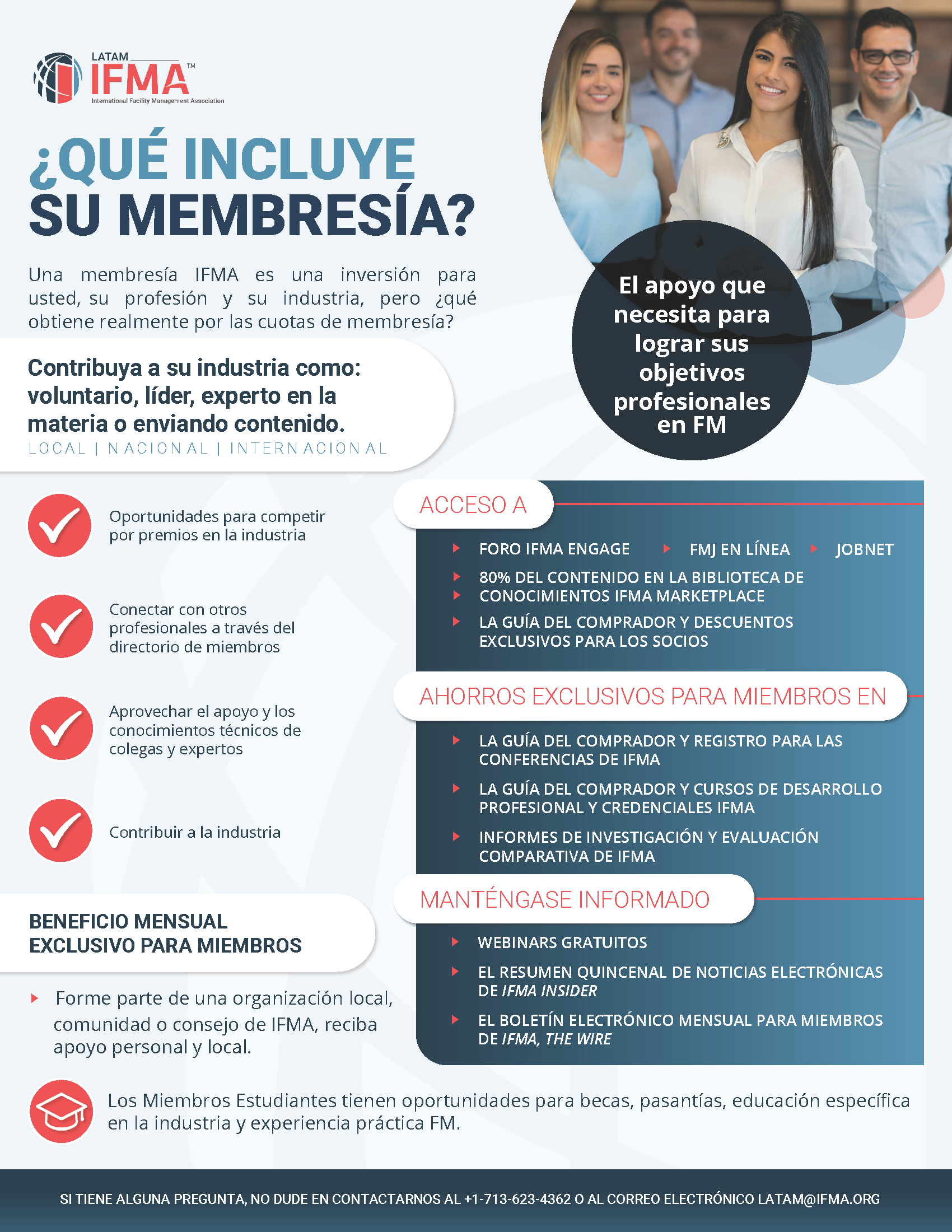 Para obtener más información sobre los beneficios, programas y servicios para miembros de IFMA, visite www.ifma.org.